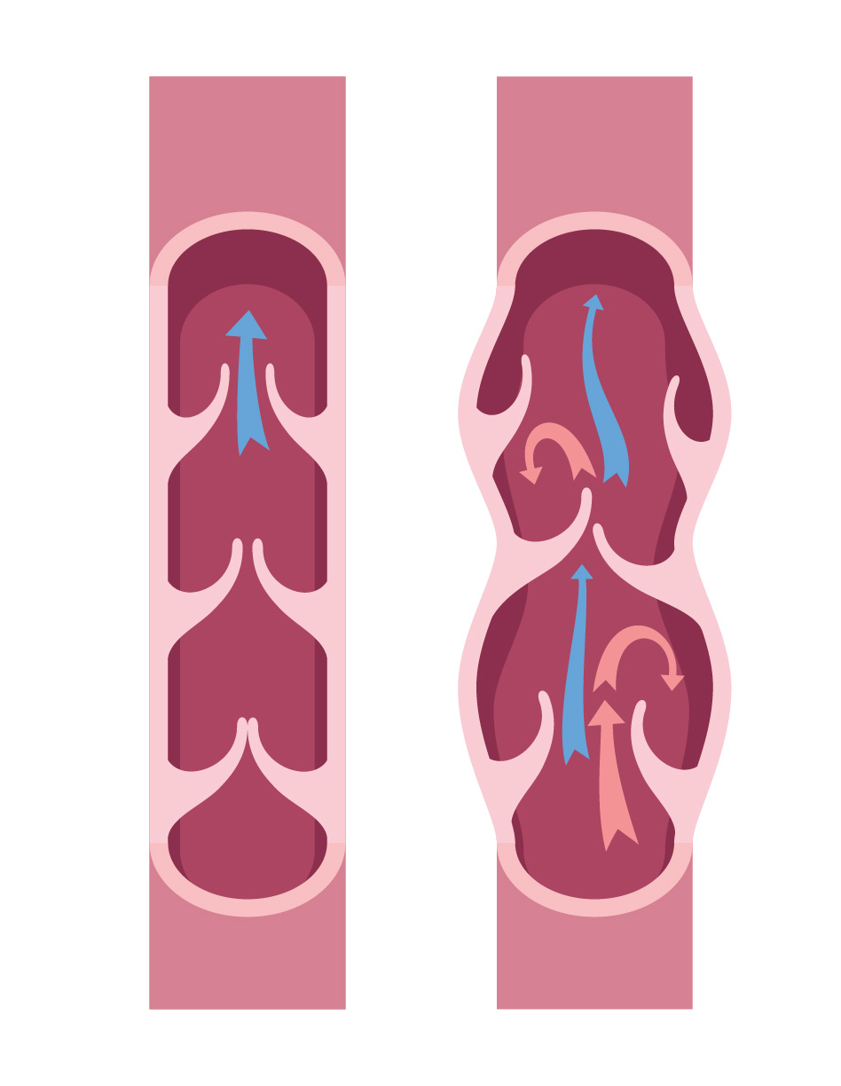 With increasing reflux, the vein becomes progressively distended, tortuous, and therefore more visible. This process also makes reflux worse and as the vein increases in diameter it becomes varicosed.